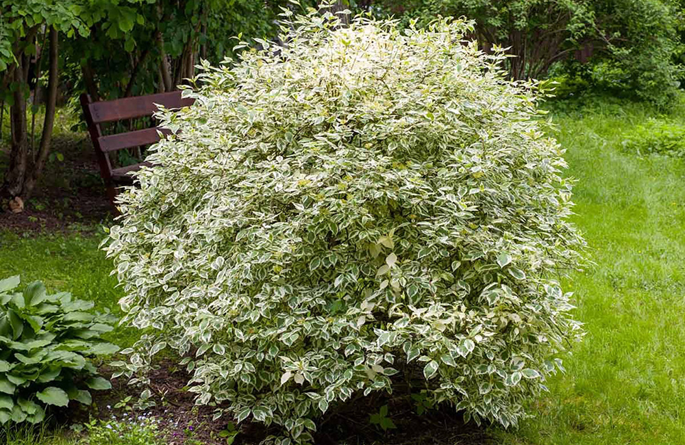 - Дёрен белый (Cornus alba) — один из самых популярных видов, особенно его сорт ‘Sibirica’ с ярко-красными зимними побегами. Другие известные сорта: ‘Elegantissima’ (с бело-зелеными листьями), ‘Aurea’ (с золотистыми листьями), ‘Gouchaultii’ (с трехцветными листьями). Эти кустарники достигают высоты 2-3 метра и отлично подходят для создания живых изгородей или ярких акцентов.