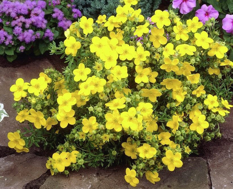 - С колокольчиками и вероникой: Эти растения с синими и фиолетовыми цветками прекрасно дополняют желтые и оранжевые сорта лапчатки, создавая яркие, солнечные клумбы.