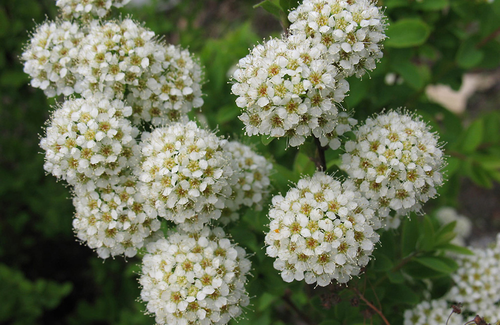 - Спирея Ниппонская (Spiraea nipponica) — сорт ‘Snowmound’ отличается плотной, округлой кроной и обильным цветением крупными белыми щитковидными соцветиями. Более компактна, до 1,5 метров.
